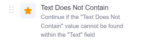 - Text Does Not Contain: The text to search in "Text". If the "Text" does not contains "Text Does Not Contain", it returns true and proceeds.
